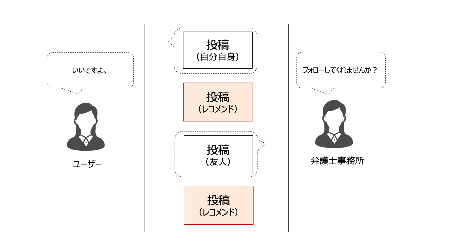 一つ目は「レコメンド」である。下の図はレコメンドの考え方を示したものだが、ユーザー自身やユーザーがフォローしている人(本記事では友人とする)が投稿・閲覧した内容に近いものを、おすすめする情報としてユーザーに表示することを指す。