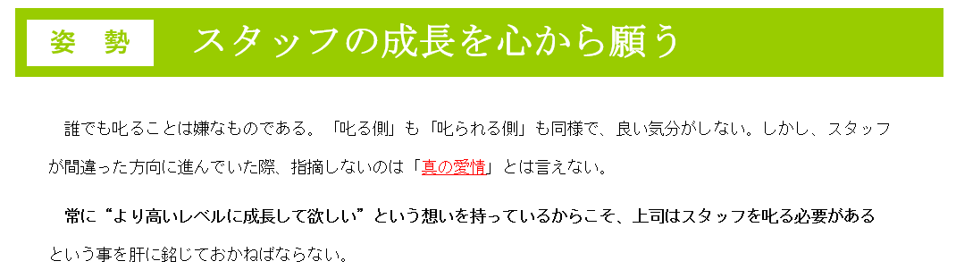 誰でも叱ることは嫌なものである。叱る側も叱られる側も同様で、良い気分がしない。しかし、スタッフが間違った方向に進んでいる際に指摘しないのは、真の愛情とは言えない。