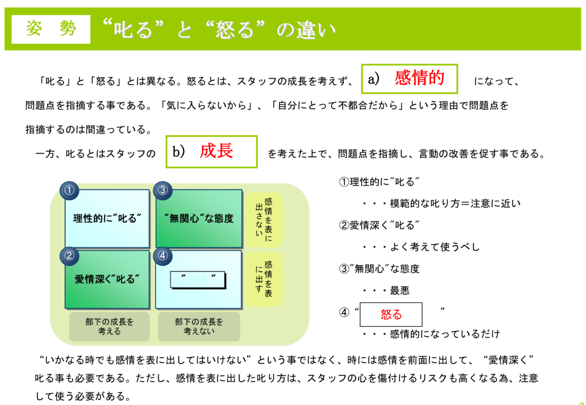 「愛情深く叱る」というのは、よく考えて使うべきである。無関心な態度は最悪であり、4つ目の「怒る」は、単に感情的になっているだけである。いかなる時でも感情を表に出してはいけない、ということではなく、時には感情を前面に出して愛情深く叱ることも重要である。ただし、感情を表に出した叱り方はスタッフの心を傷つけるため、注意をして使う必要がある。