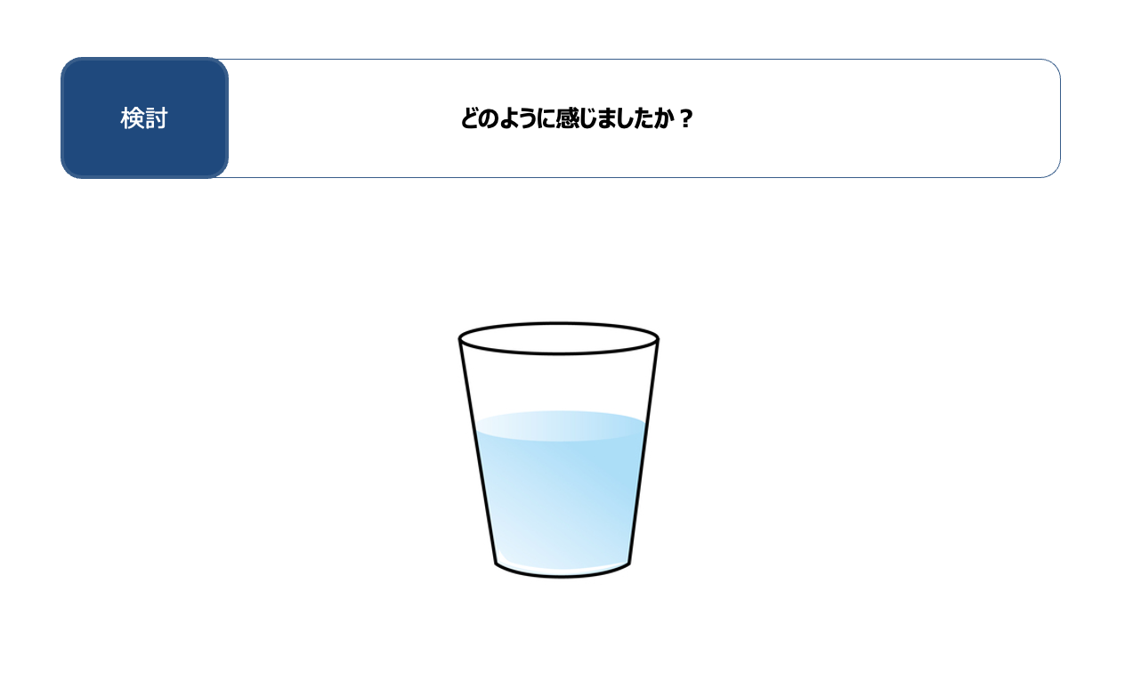まず、下の図をご覧いただきたい。コップに水が半分入っているが、どのように感じるだろうか。