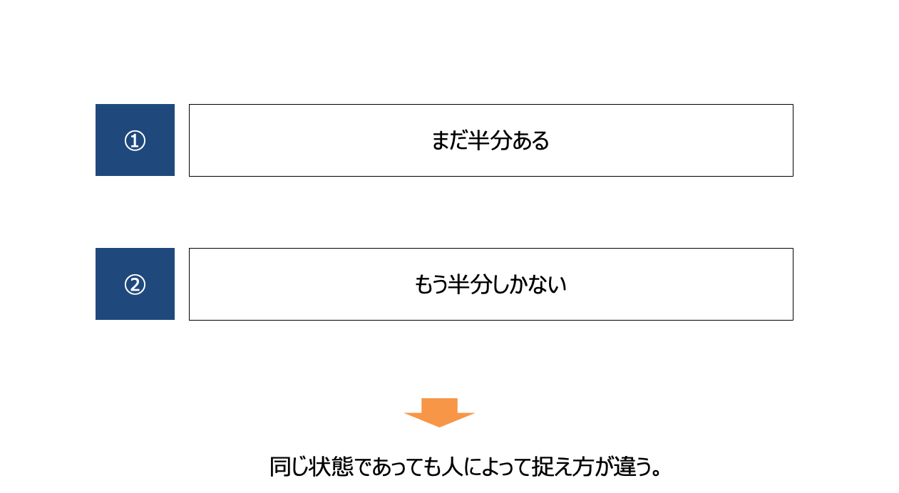 これは人によって解釈がさまざまである。「まだ半分もある」と思うのか、「もう半分しかない」と思うのか。このように、同じ事実であっても捉え方が人によって異なる。