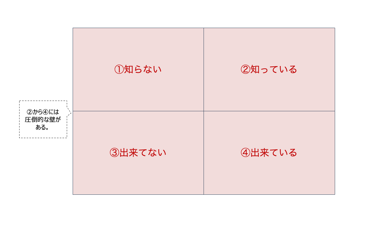 また、100%知っている事例だったとしても、それを「できていない」場合、「100%知っているから」と思考停止するのか、「できていないから」と定義し、貪欲に情報を吸収していくのかによって、成果の度合いが変わってくる。この「知っている」と「できている」の間には圧倒的な壁がある。しかし、「できていない」にもかかわらず、「知っている」だけで「その情報は不要だ」と判断する人もいるだろう。これを三つのパターンで分けると、下の図のようになる。