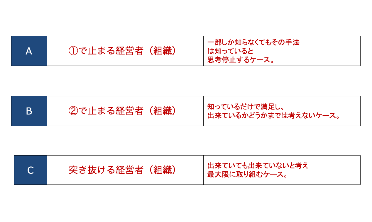 パターンAは①で止まるリーダーである。一部しか知らなくても「その手法は知っている」と思考停止するケースで、先ほどの水の例で言えば、半分しか水がないのに「まだ半分もある」と満足してしまうケースにあたる。次に、Bパターンは②で止まるリーダーである。知っているだけで満足し、できているかどうかまでは考えないケースである。