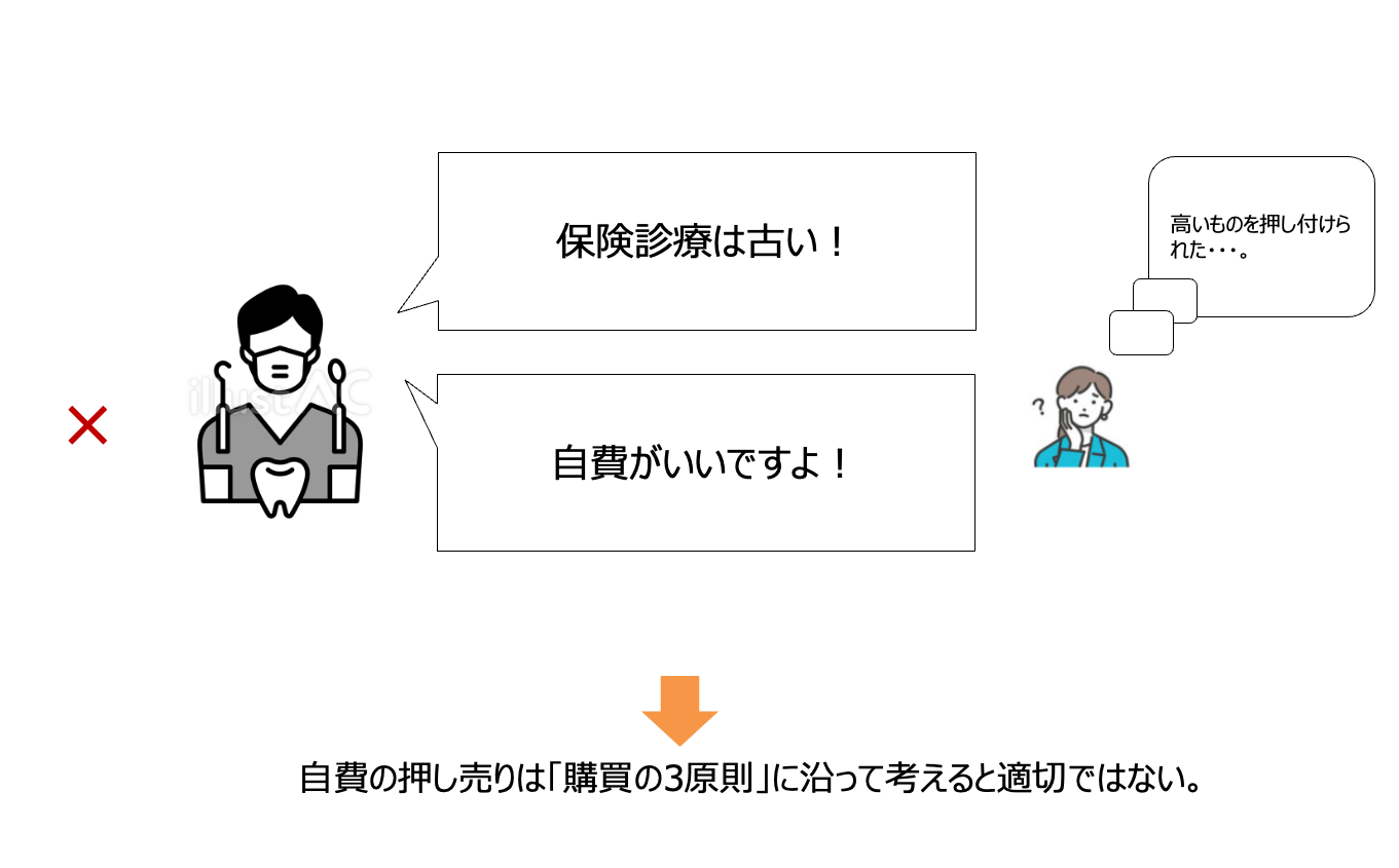まず一つ目の観点として大切なのは、メリットとデメリットをきちんと伝えることです。下の図にあるように、「保険診療は古いから自費診療が良いですよ」といった一方的な押し売りは逆効果になります。患者様は高額な治療を押し付けられたと感じてしまうからです。