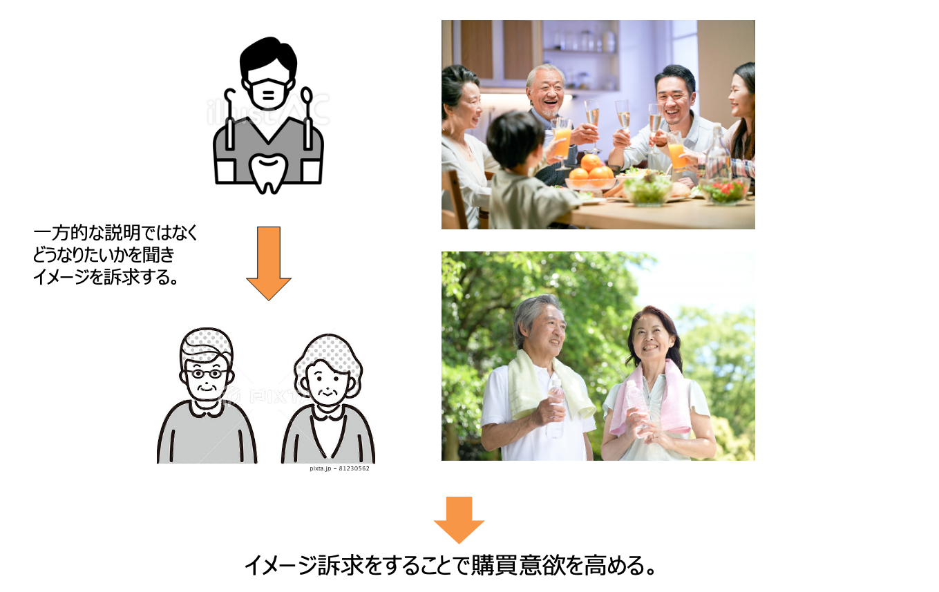 これは、価値を認めたものにお金を払うという考え方に基づくものです。そのためには、イメージ訴求が非常に重要になります。一方的に説明をするのではなく、その治療によって「どのようになりたいのか」というイメージを患者様と共有し、共感を通じて購買意欲を高めていくことが大切です。