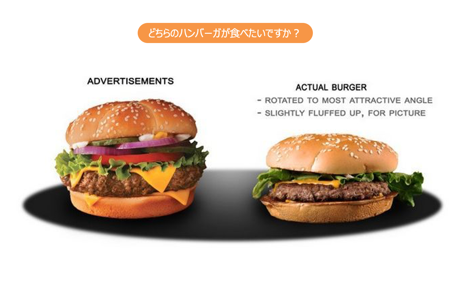 二つのハンバーガーが並んでいるが、どちらのハンバーガーを食べたいだろうか。多くの読者は左側と答えるであろう。飲食業界において、メニューに右側のような写真を載せるケースは少ない。しかし、歯科業界においては、ホームページの症例写真が、まさにこの右側の写真のようになっているケースがよく見られる。例えば下の図をご覧いただきたい。