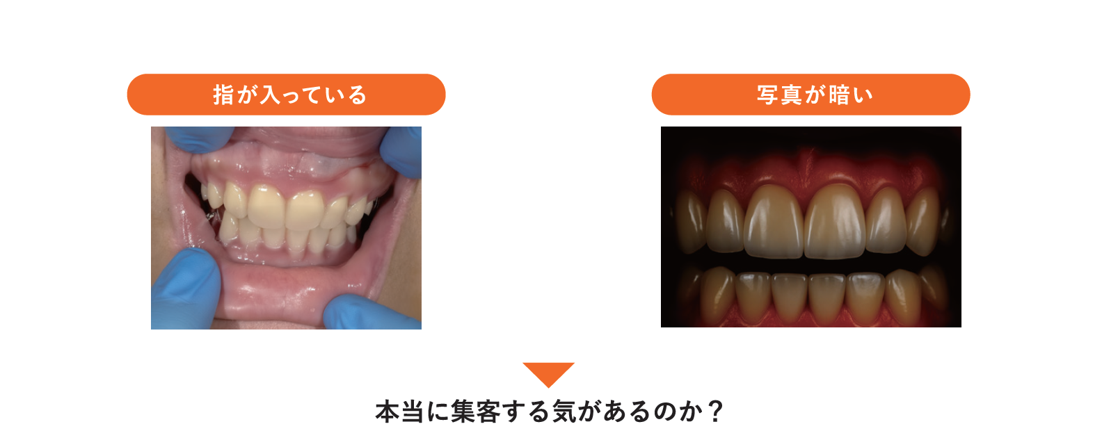 こちらの図は、症例写真に医師の指が写り込んでいたり、照明が暗く治療部位がはっきり見えなかったりするケースである。このような場合、本当に自費診療としてプライドを持って集客するつもりがあるのかと問いたくなる。当然、撮影環境の制約や、写真撮影に慣れていないスタッフが担当するケースもあるだろう。