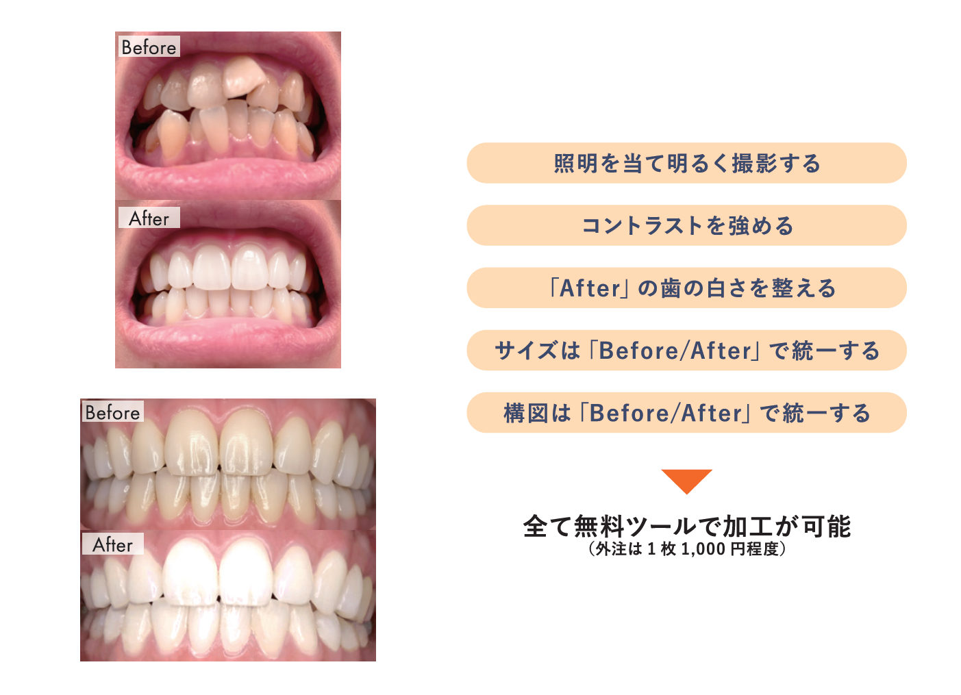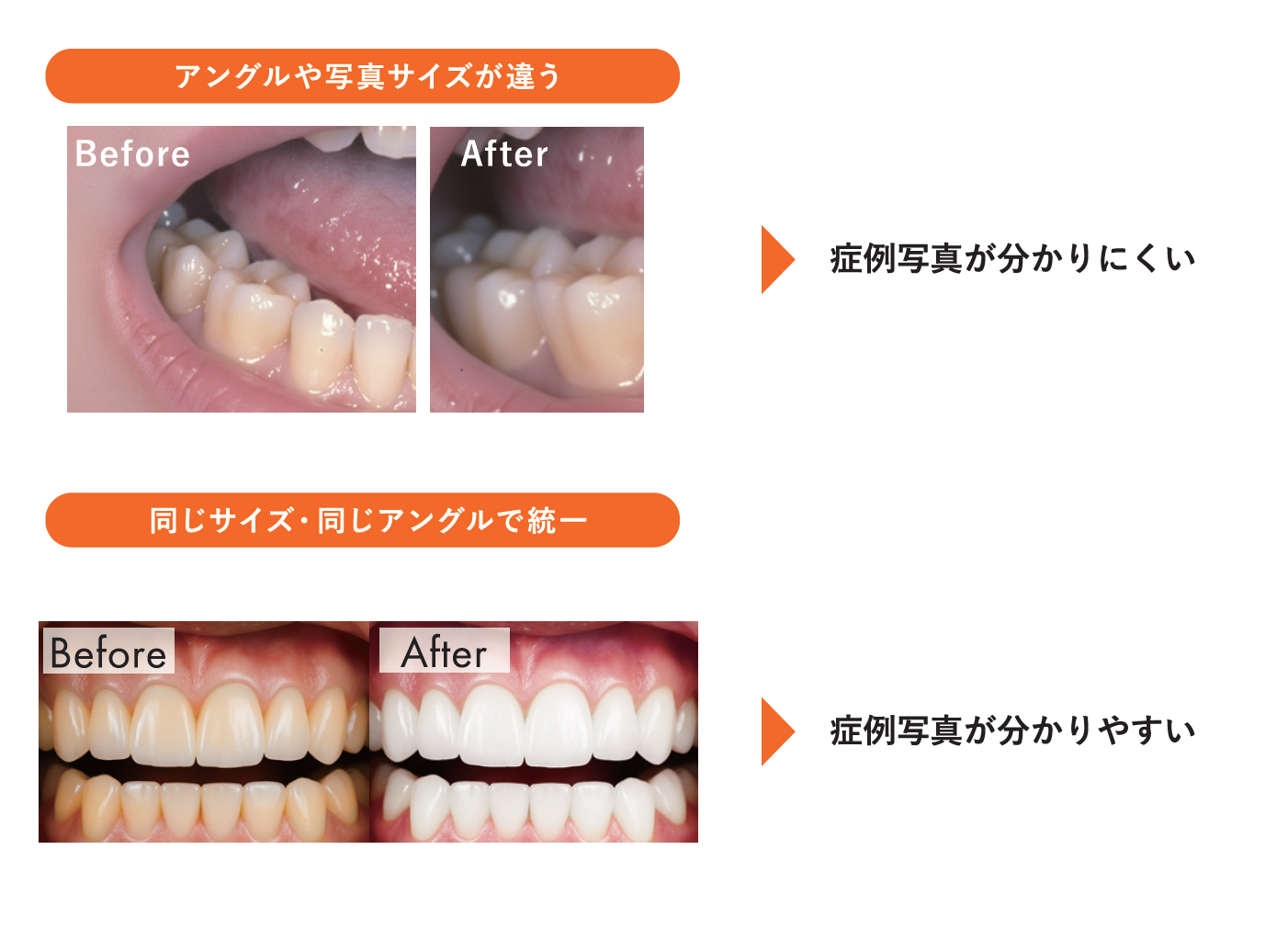 このような調整ツールは無料であり、容易に加工ができるため、ツールを活用してしっかりと見せ方を強化することが重要なのである。また、写真の撮り方一つとっても症例写真の印象は大きく変わる。例えば下の図のように、ビフォーアフターの写真でアングルや写真サイズが異なっており、治療の成果がわかりにくいケースがある。