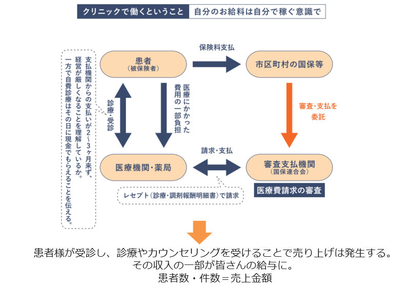 一方で、自費診療はその日に現金がもらえるということで、保険とのキャッシュフローの違いをしっかり理解してもらうことが重要です。患者様が受診し、診療やその他自費サービス・自費商品購入を受けることで売り上げが発生し、その収入の一部がスタッフの給料になります。つまり 、患者数や件数=利益金額 ということを理解してもらうことが重要なのです。
