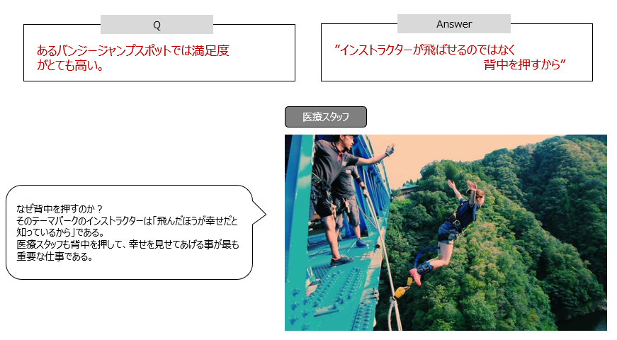 あるバンジージャンプのスポットでは、非常に満足度が高いと有名になりました。その理由は、インストラクターが「積極的に背中を押すから」と言われています。そのバンジージャンプのスポットのインストラクターは、参加者が飛んだ方が幸せだと理解しているから、堂々と背中を押すのです。