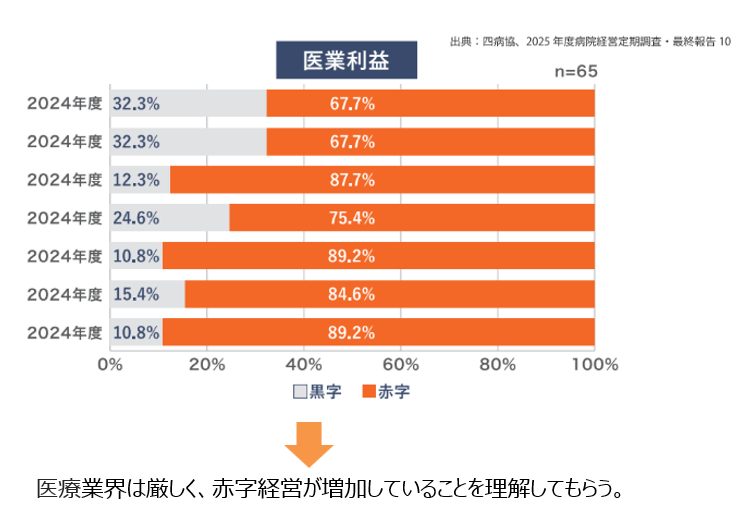 まず、一つ目の業界の厳しさについては、図1をご覧ください。医業利益の赤字割合は、ここ数年で約7〜9割に達しています。医療業界は厳しく、赤字経営が増加しているということをスタッフに理解してもらうことが、自費診療を増やす上では重要なのです。
