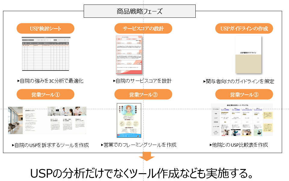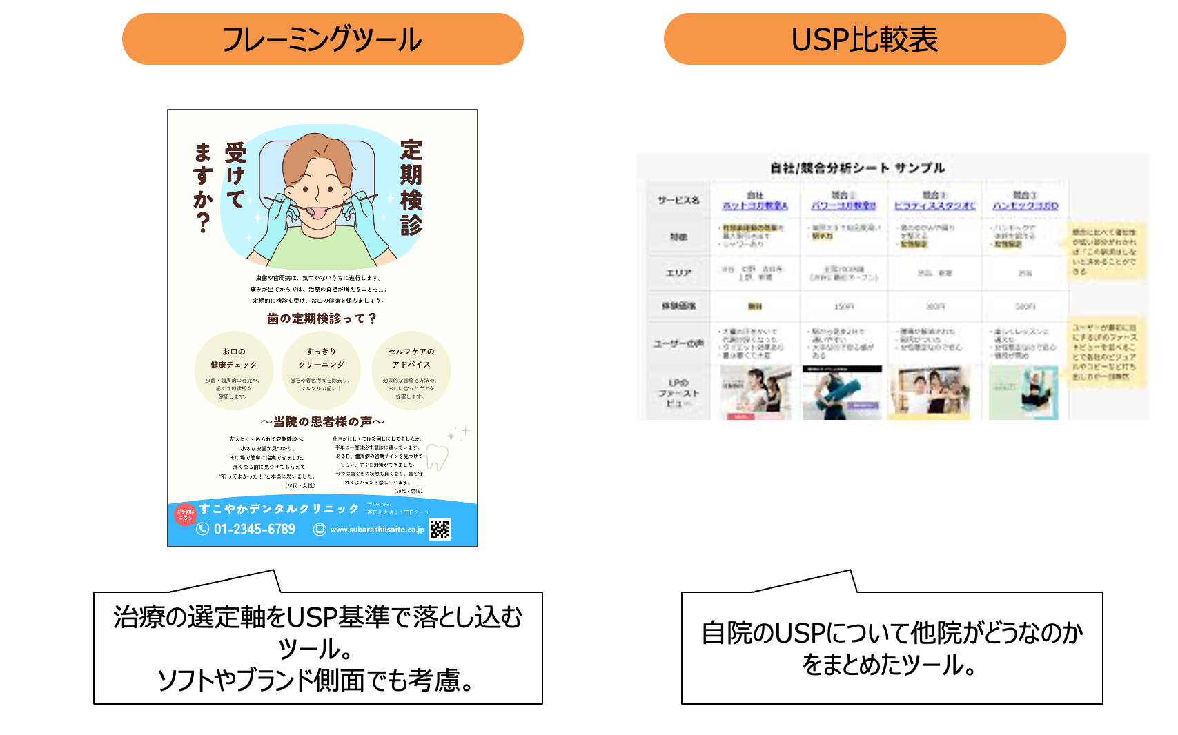 究極的に言えば、この10ページ未満のコンセプトブックだけで自院のUSPが伝わり、契約ができる体制ができるのである。また、それ以外にも、自院のUSPや強みを治療選択の判断軸として訴求する「フレーミングツール」や、自院のUSPが他院と比較してどこが優れていて、他院はどこが劣っているのかを説明した「USP比較表」などもカウンセリングや説明時のツールとして制作している。