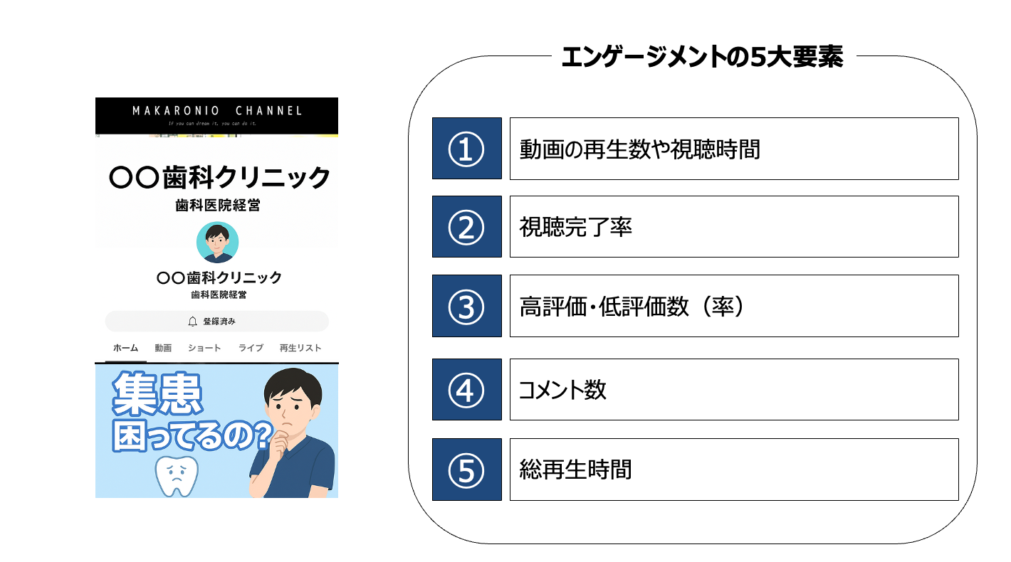 一方、YouTubeの場合は、下の図の五つの指標となる。これらの数字を増やせば増やすほど、治療検討者の関連動画枠に表示されやすくなり、来院につながるのである。
