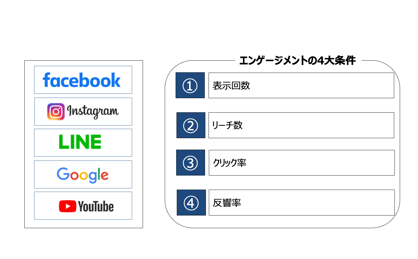 広告におけるエンゲージメントは、表示回数、リーチ数、クリック率、反響率となっている。これらは、グーグル広告やFacebook、インスタグラムなどのメタ広告も同様であり、この四つの指標を押さえることが非常に重要なのである。