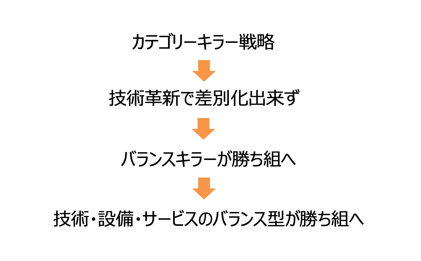 この「商品」という観点においては、従来、カテゴリーキラー戦略、すなわち技術や設備といった一本軸で勝負する戦略が主流であった。しかし、技術革新により差別化が難しくなり、カテゴリーキラーではなく「バランスキラー」が勝ち組になっている。