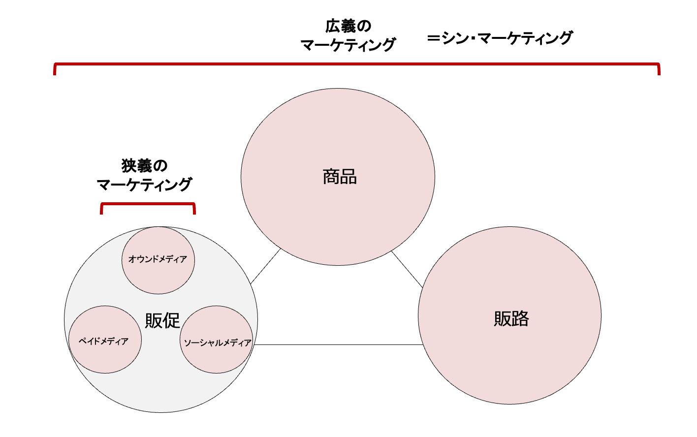 しかし、弊社の定義するマーケティングは、「商品・販促・販路」という三領域を対象とする。ここを我々は「広義のマーケティング」とし、「シン・マーケティング」として提唱し、支援を行っている。