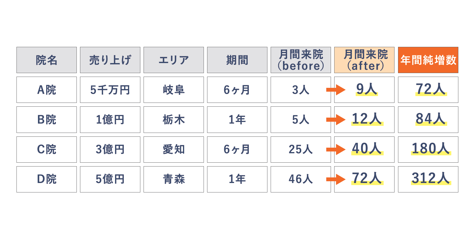 自院の取り組みが、このシン・マーケティングの領域に入っているかどうかは、今一度確認していただきたい。成果事例としては、下の図にあるように、純増数は規模によって変動があるものの、毎月5組以上の来院増加に成功している。
