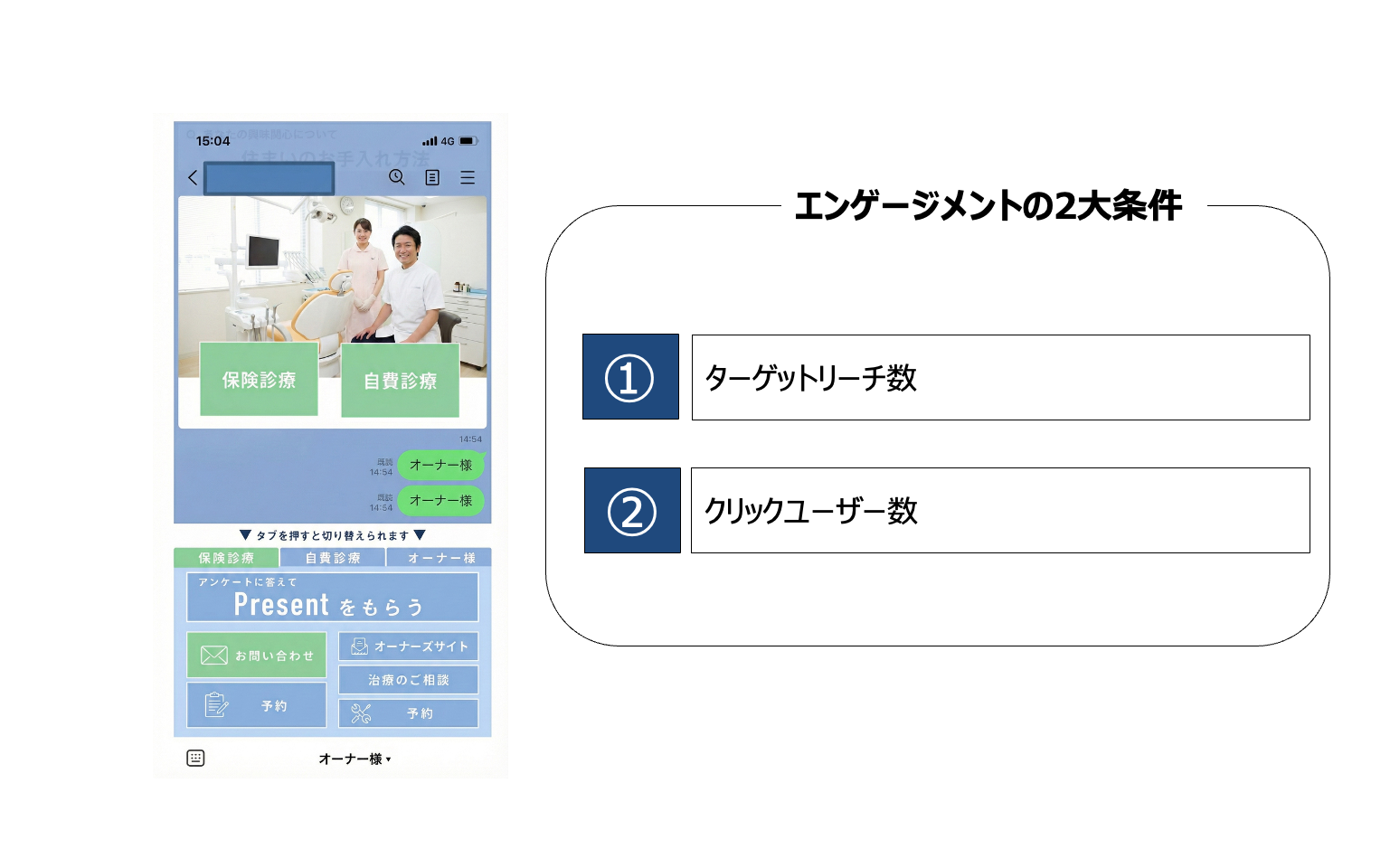 ターゲットリーチ数は、友だち数からブロック数を引いた数であり、クリックユーザー数は、自院のメニューページをタップした数になる。なお、ホームページやイベントに紐づく広告においても、当然ながらエンゲージメントは存在する。ホームページでいうと、リピート率、滞在時間、閲覧ページ数である。