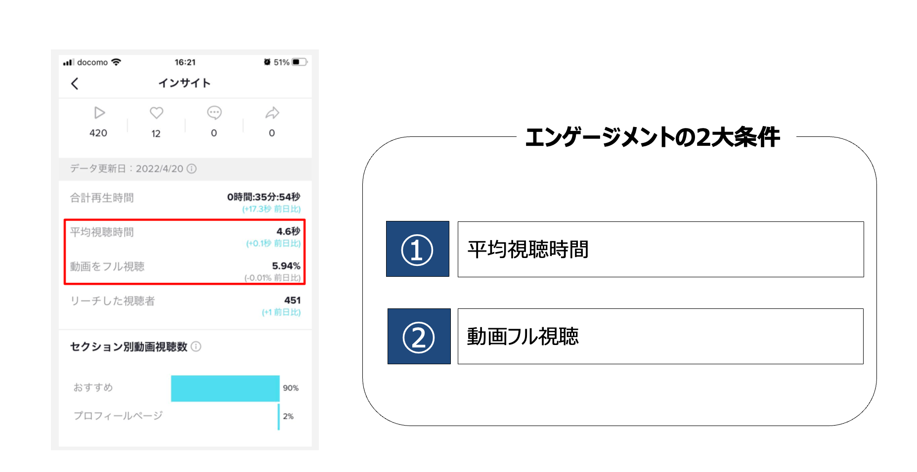 TikTokについては、図11の二つの指標となる。平均視聴時間と動画フル視聴の数値が高ければ、エンゲージメントが高く、来院につながる。