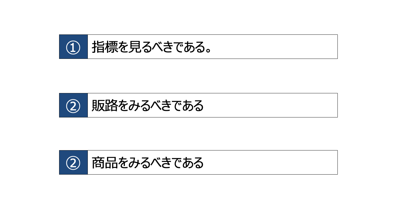 では、それぞれに対して、ただ単にホームページの改善や投稿、インスタグラムの投稿などを漠然と行っていればよいのであろうか。いや、そうではない。進める上で三つのポイントがある。順番に説明していこう。一つ目は指標を見るということ、二つ目が販路を見るということ、三つ目が商品を見るということである。順番に説明していこう。