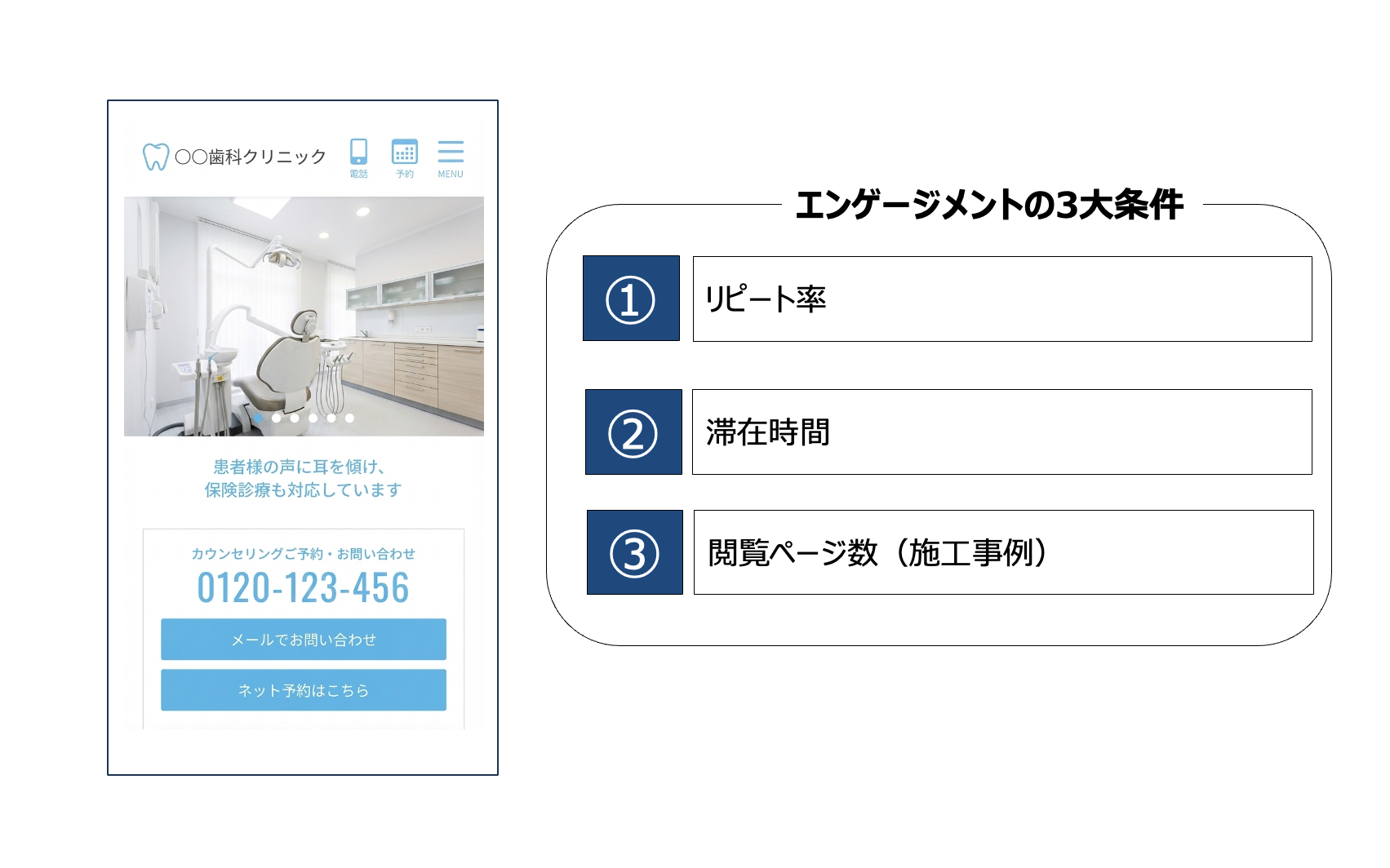 同じように滞在時間も重要であり、また反響との相関でいうと、治療事例を何ページ見たかといった治療事例の閲覧ページ数も反響と相関があるため、エンゲージメントとして重要な指標になる。