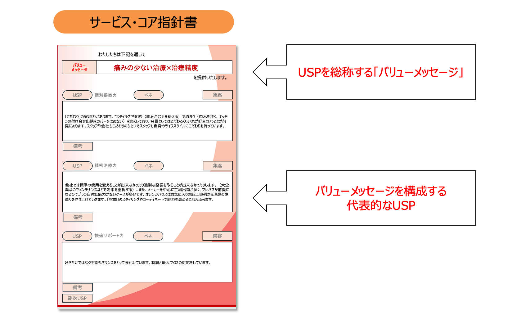 バリューメッセージと構成要素に分かれるのであるが、バリューメッセージは、例えば「痛みの少ない治療」というキャッチフレーズである。これは、USPを一言のメッセージで表現したものである。一方、構成要素とは、文字通りUSPを構成する要素であるが、医院で言えば設備や治療技術、診療サービスなどの構成を説明した内容である。