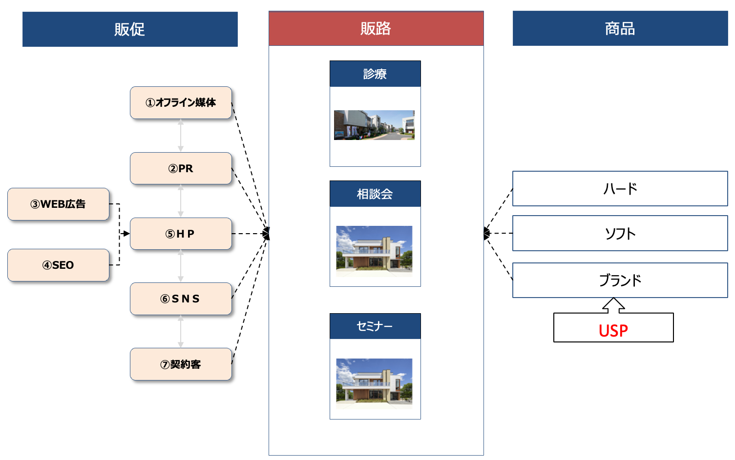 今までの内容をまとめると、従来のトリプルメディアの改善という取り組みは、あくまで販促に過ぎない。それだけではなく、商品戦略や販路戦略という視点を持たなければ成果にはつながらないのである。一般的なマーケティングは、この「販促」のみを扱うことが多い。