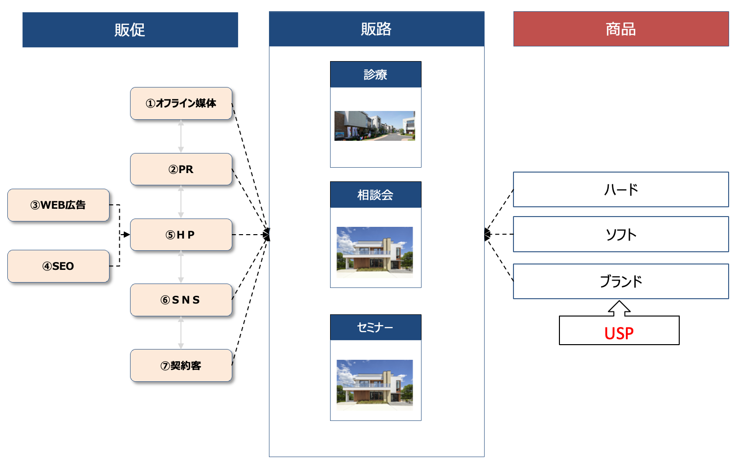 つまり、入口設計だけでなく、出口設計が必要なのである。この観点でいくと、販促はKPIを指し、販路とは来院・契約といったKGI、つまり最終ゴールを指すのである。