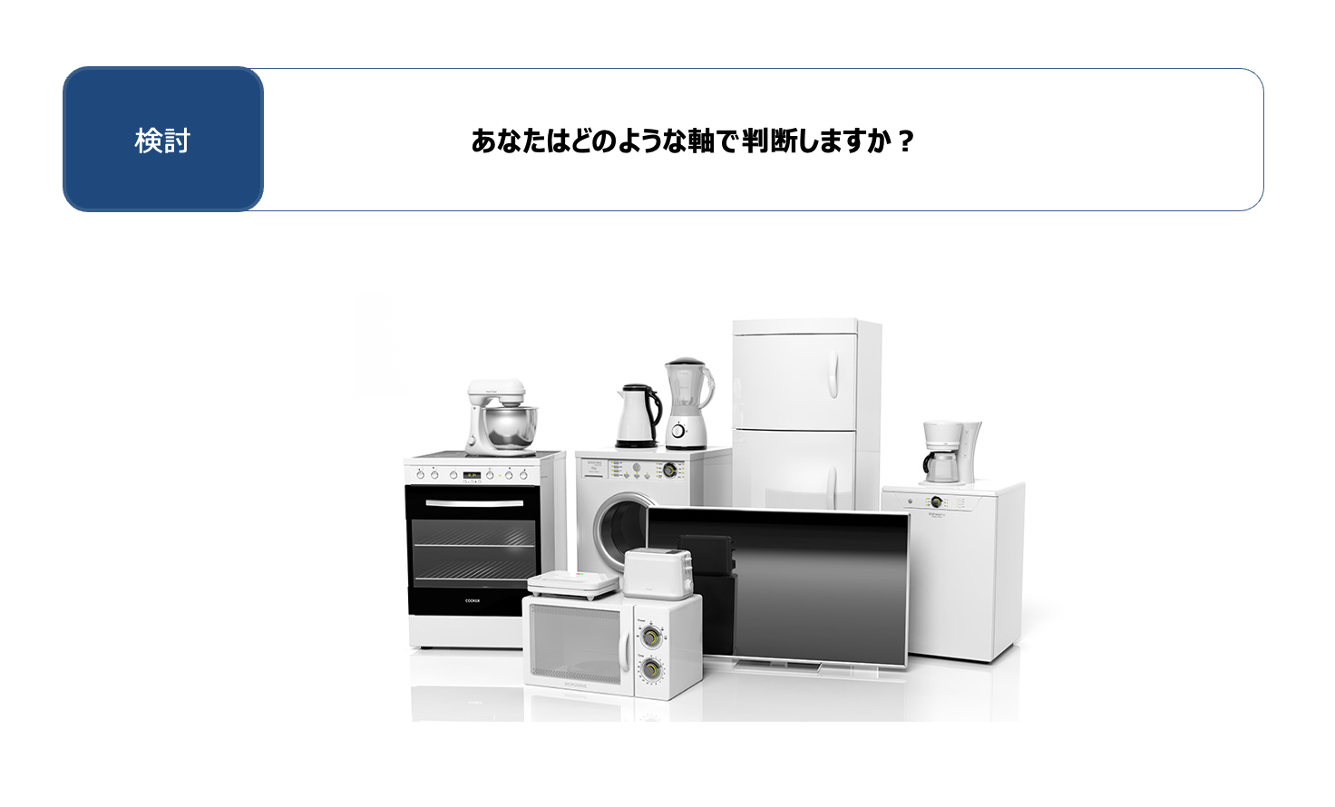 この考え方をもう少し細かく見てみよう。例えば、あなたは家電量販店などで家電を購入する際に、どのような軸で判断するだろうか。多くの方は、ハード・ソフト・ブランドで比較をするのではないだろうか。これは多くの業界で当てはまる現象である。