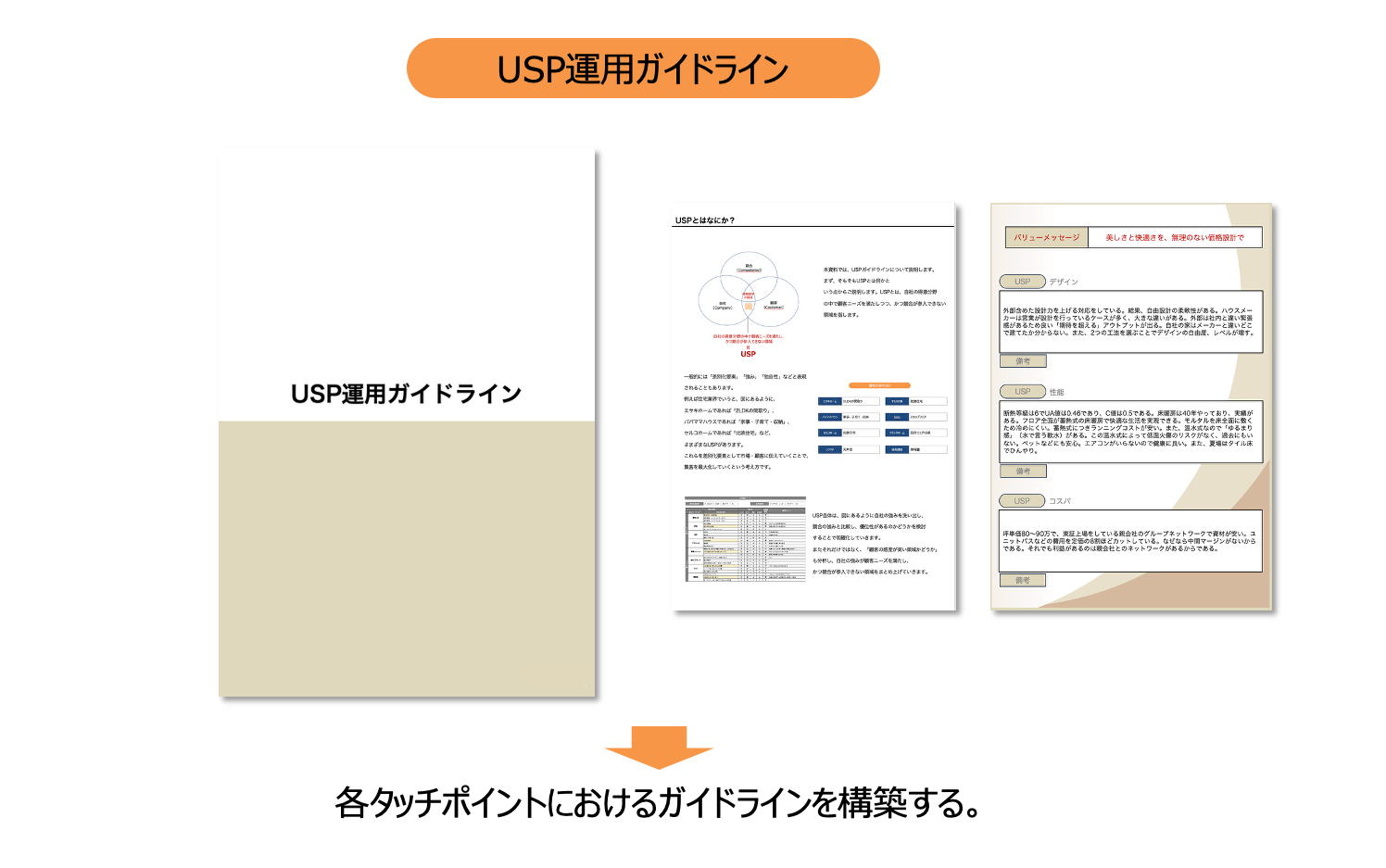 このガイドラインをホームページの業者やインスタグラムの投稿代行の会社、LINEの運用会社、広告の運用会社などに共有し、一貫性を持った発信をしてもらうのである。 また、下の図にあるように、タッチポイントに対してUSPを訴求するのは何も業者だけではない。