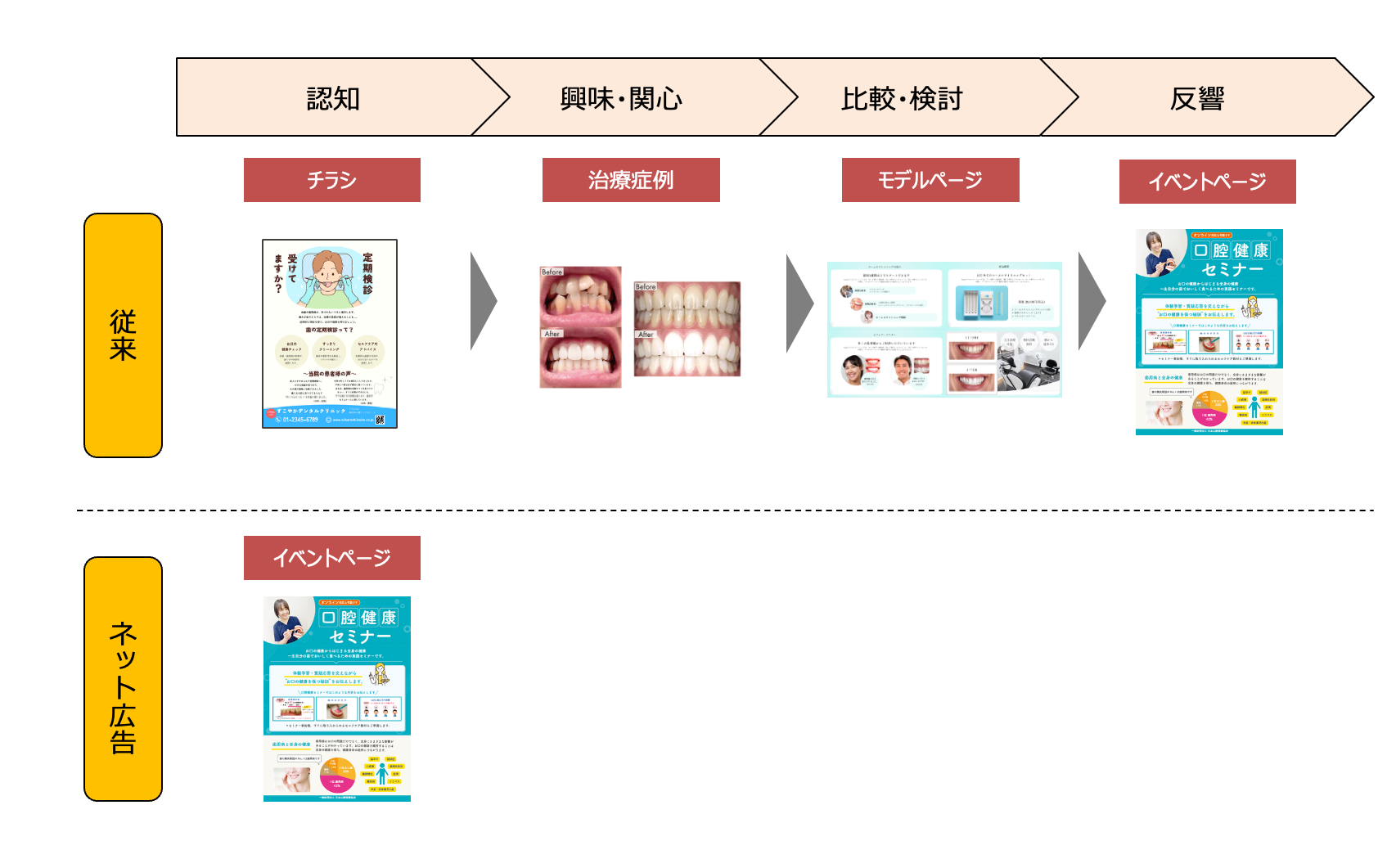 そして、モデルページなどで比較検討を行い、最終的にイベントページで反響するといった流れになるのである。一方で、インターネット広告の場合は、一番最初のタッチポイントがイベントページになる。そのイベントページが自院の強みなどを訴求せず、イベント案内だけを行っていたらどうだろうか。多くの見込み患者が魅力を感じずに離脱してしまうであろう。つまり、イベントページにおいて院の強みなどを訴求していなければ、単なるイベントの案内になってしまい、反響につながらないのである。