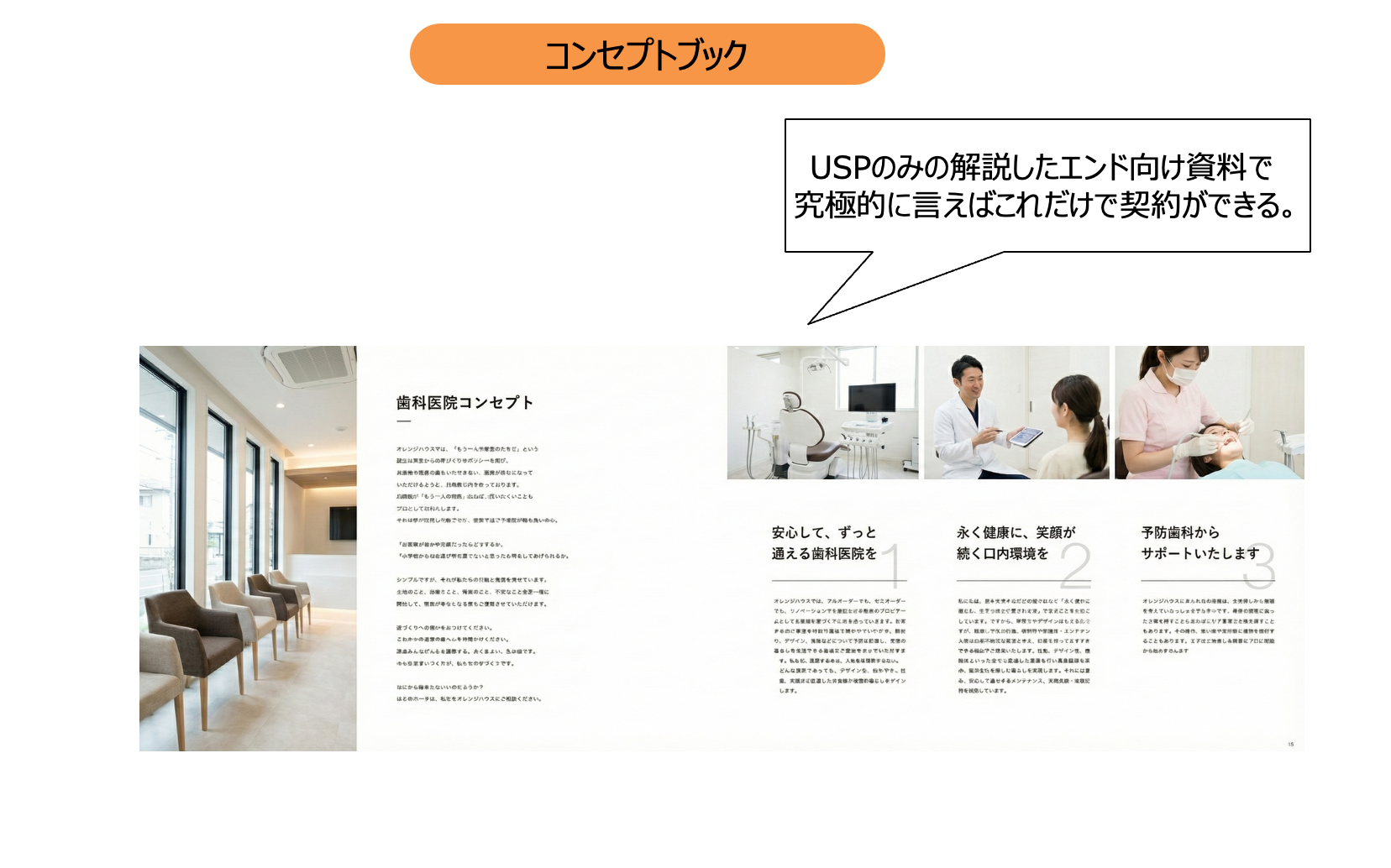 診療スタッフも、この中で重要な役割を担うのである。スタッフは正しく患者に自院のUSPを伝えているだろうか。例えば、弊社ではこのような自院の強みをまとめたUSPをベースとした「コンセプトブック」というものを制作している。