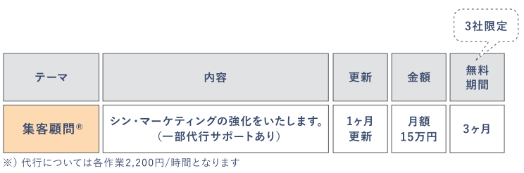 また、インスタグラムの投稿、イベントページの作成やブログの更新を代行してほしいといった代行サポートについての相談を受けることも多く、その場合は時間単価で2200円にて対応している。弊社では、この代行領域で収益化していないため、専門職における最低賃金で提供している。現在、インスタグラム投稿の代行などで月15万円や30万円といった費用がまかり通っているが、このような価格体系は過剰価格であり、悪質な商法である。