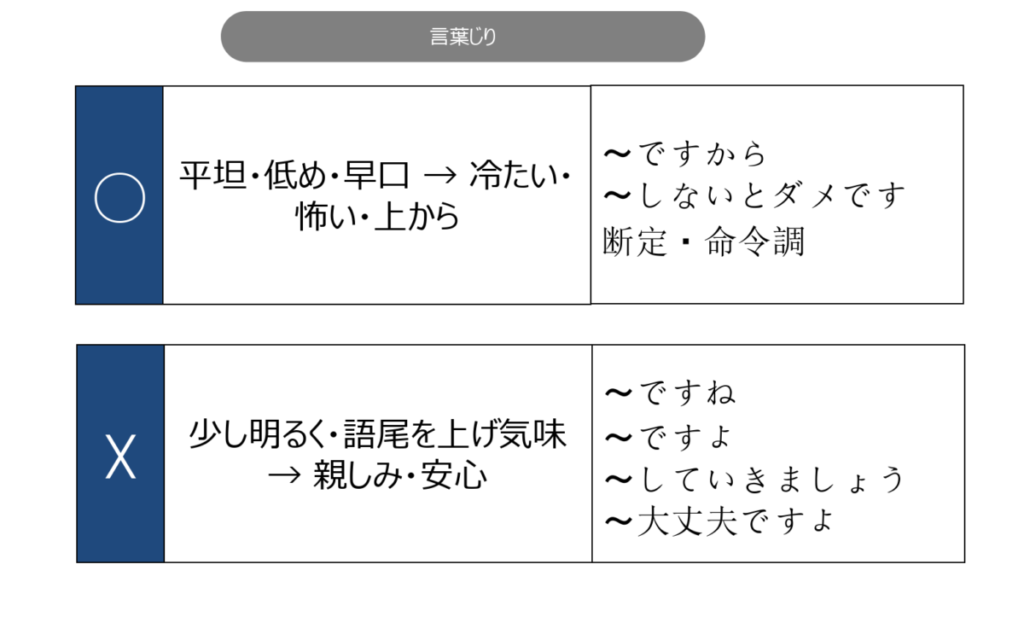 例えば、望ましさでいうと言葉尻なども当てはまります。平坦なトーンや低めの声、早口などは冷たい・怖い・高圧的という印象を与えてしまい、「〇〇ですから、〇〇しないとダメです」といった断定・命令口調は避けて少し明るく語気を上げ気味にし、親しみと安心感を持って会話をするように心掛けましょう。