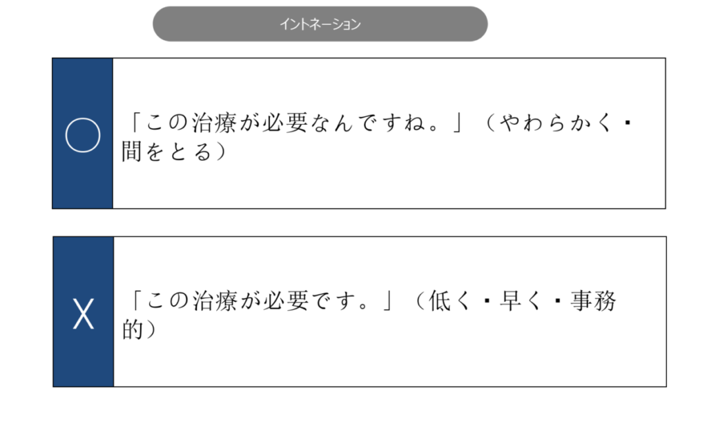 また、言葉のイントネーションも重要です。例えば「この治療が必要なんですね」と柔らかく間を取ることが重要であり、「この治療が必要です」と低く早く事務的に伝えることは控えなければなりません。