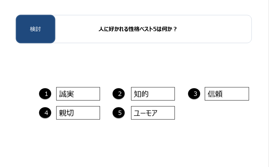 また、ある科学者の研究によると、人に好かれる要素のベスト5は誠実・知的・信頼・親切・ユーモアです。ですから、特に誠実であるかという点をしっかりと心掛けるべきでしょう。このような社会的望ましさはクリニック全体にも言えることです。