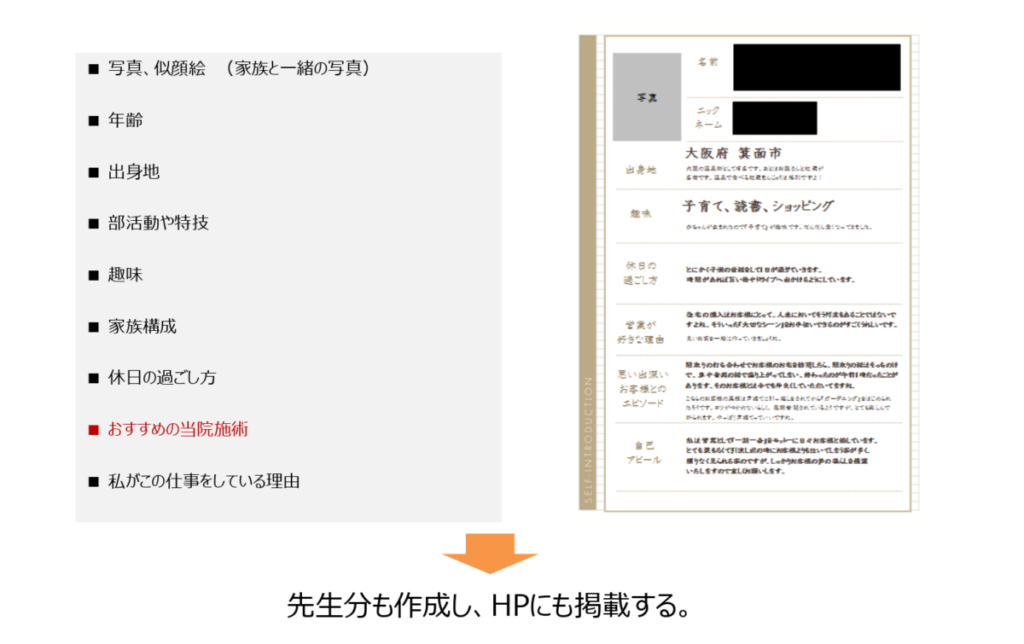 次に自己開示です。自己開示とはその名の通り、医療従事者が自分がどんな人間なのかを患者に知ってもらうことです。人間関係が親密になっていく過程においては、パーソナルな情報交換が非常に重要な役割を果たします。とはいえ、突然自分の話を始めても患者は違和感を覚えるだけであるため、自身の情報をまとめた自己紹介カードを活用すると効果的です。下の図のような項目でプロフィールを書き、推薦文を作成してホームページに掲載するのも良いでしょう。
